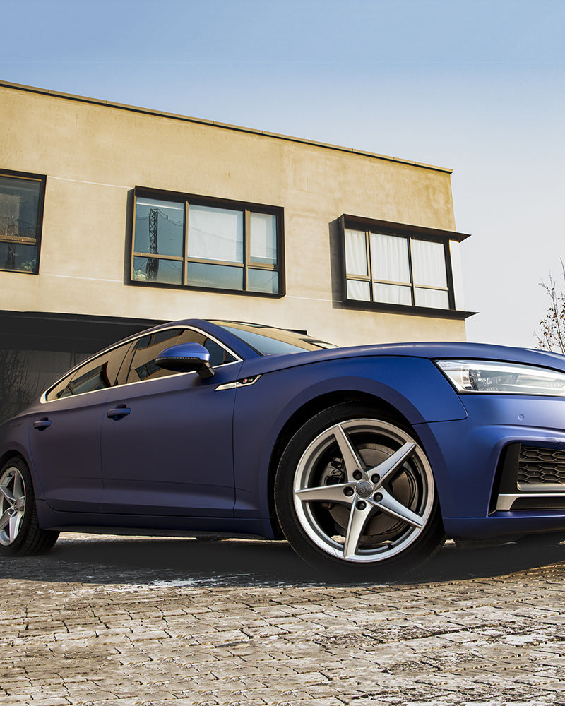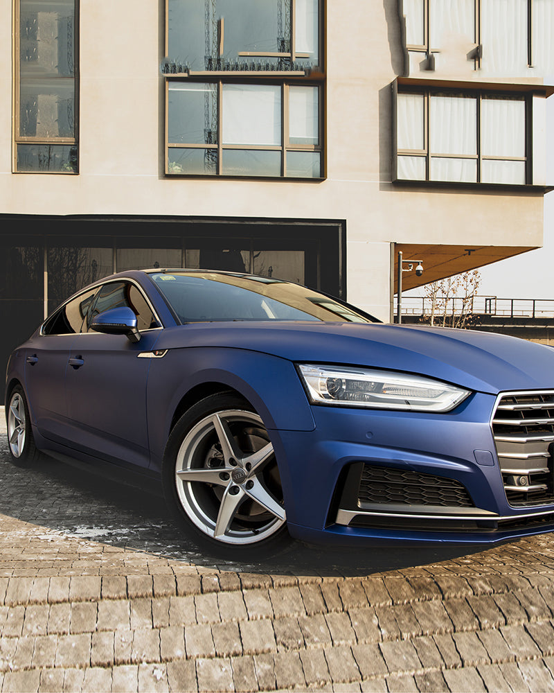 The car features an Anole Satin Chrome Silk Ultramarine Vinyl Wrap, a rich and deep blue hue with a luxurious satin finish.